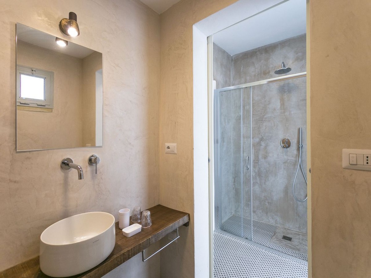 - Suite dotate di grande bagno composto da doppio lavabo con ciotole poggiate su piano progettato e realizzato su misura e doppi specchi. una zona relax con angolo doccia e vasca ricavata all’interno di un vecchio focolare precedentemente adibito come dispensa d’olio d’oliva, cassaforte e minifrigo ( riempimento su richiesta a pagamento).