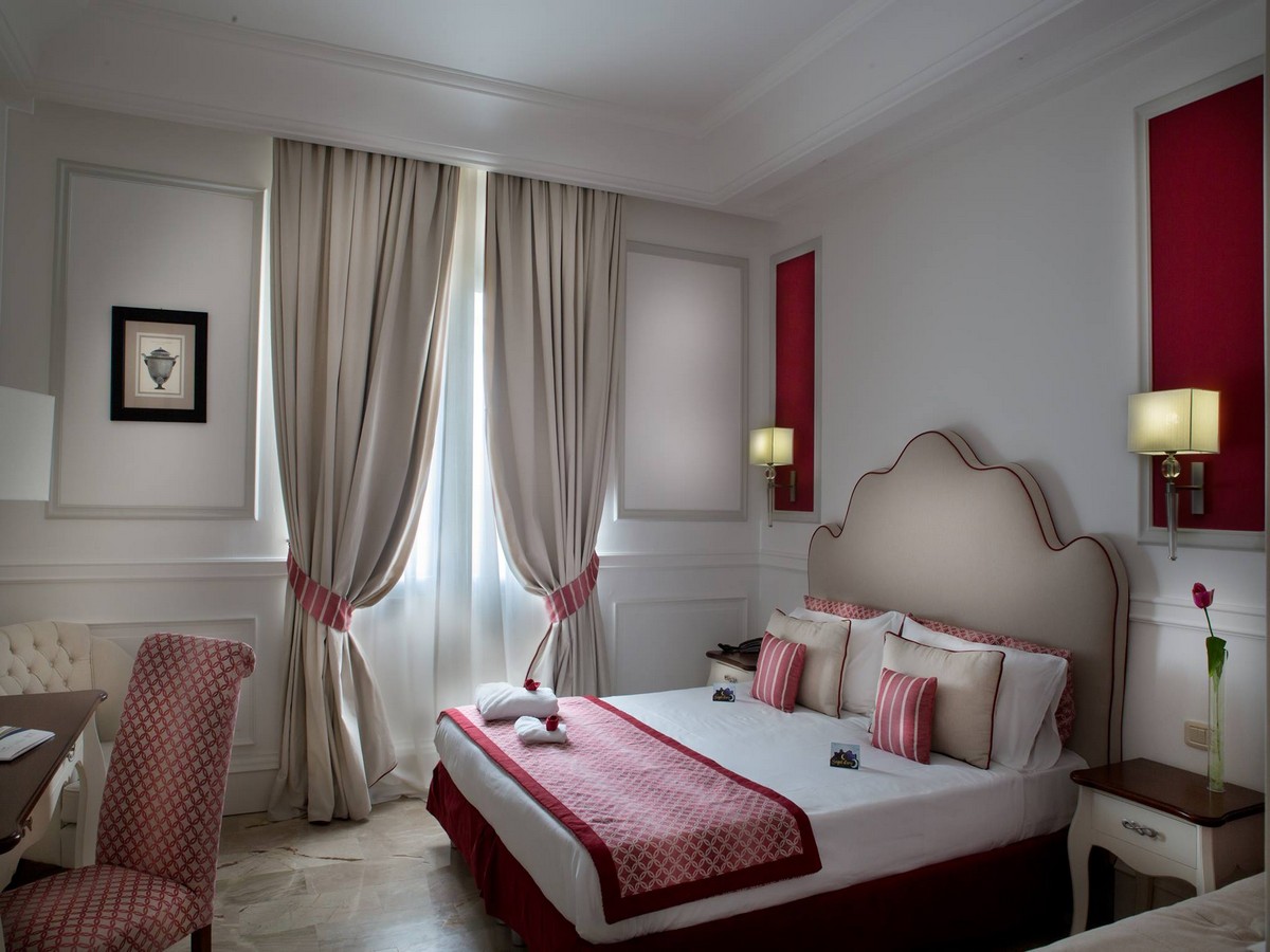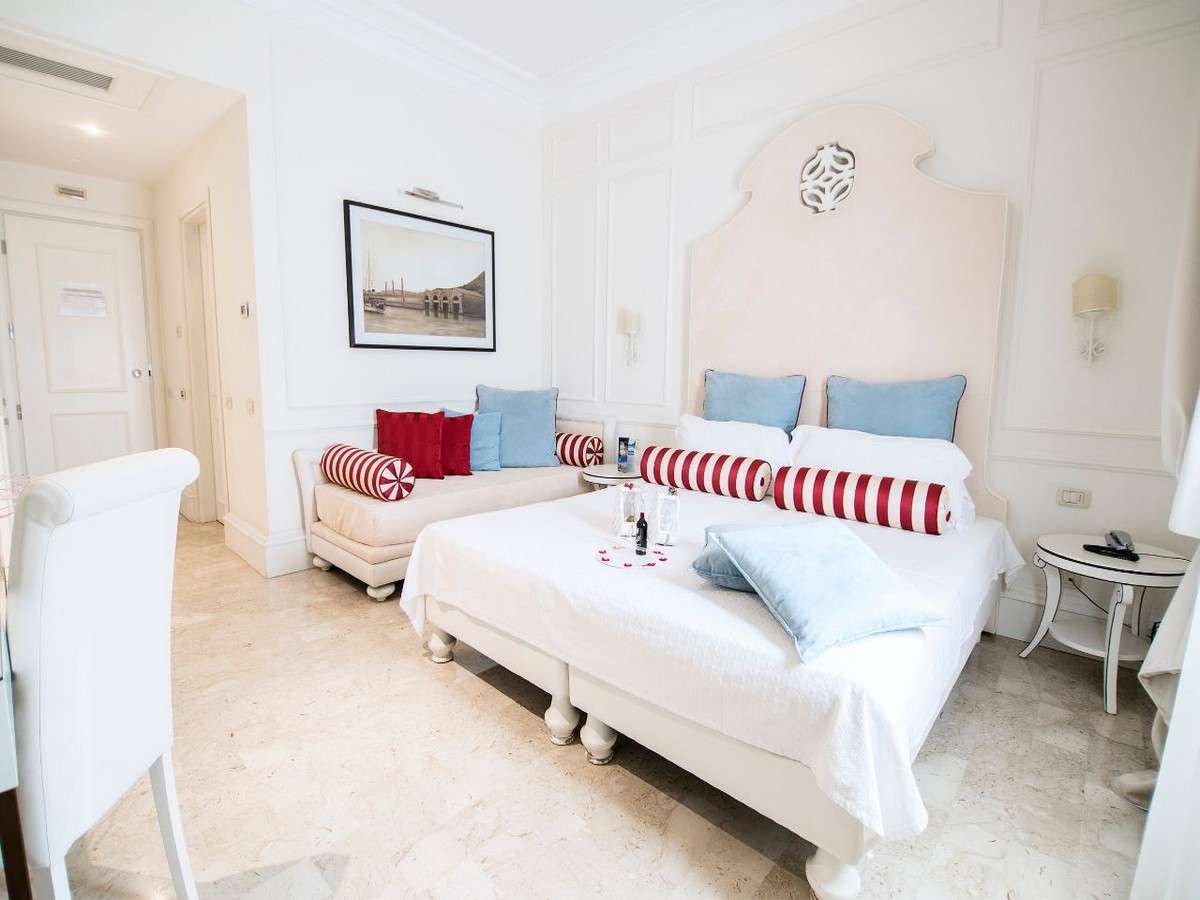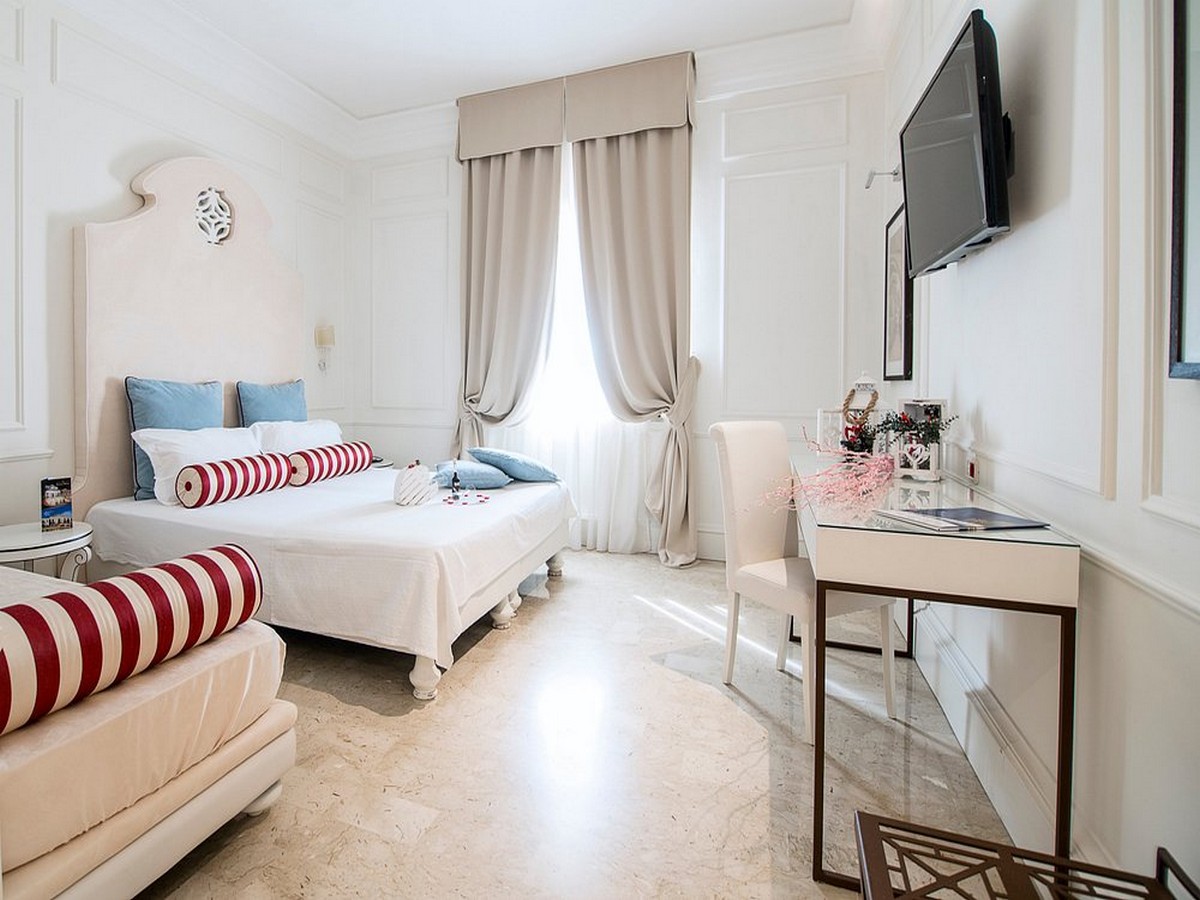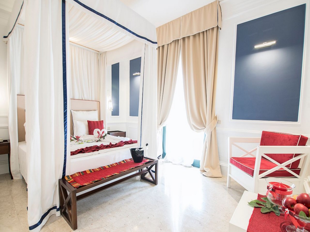 DEPENDANCE: doppio ambiente (ca 50 mq, da 2 a 4 posti letto) con ingresso indipendente, situate a poca distanza dai servizi, arredate con tutti i comfort, ideali per famiglie, cassetta di sicurezza, aria condizionata, minibar, servizio privato con doccia. DELUXE: unico ambiente (ca 25 mq, da 2 a 3 posti letto), situate nel corpo centrale, alcune con balcone, arredate con un elegante stile classico rivisitato in chiave moderna e bagno in marmo, cassetta di sicurezza, aria condizionata, minibar, servizio privato con doccia.