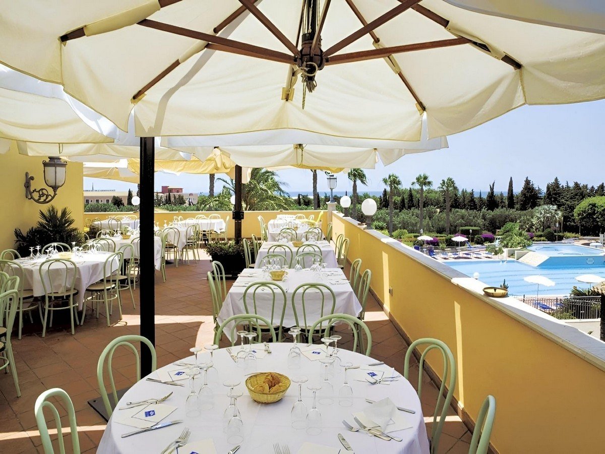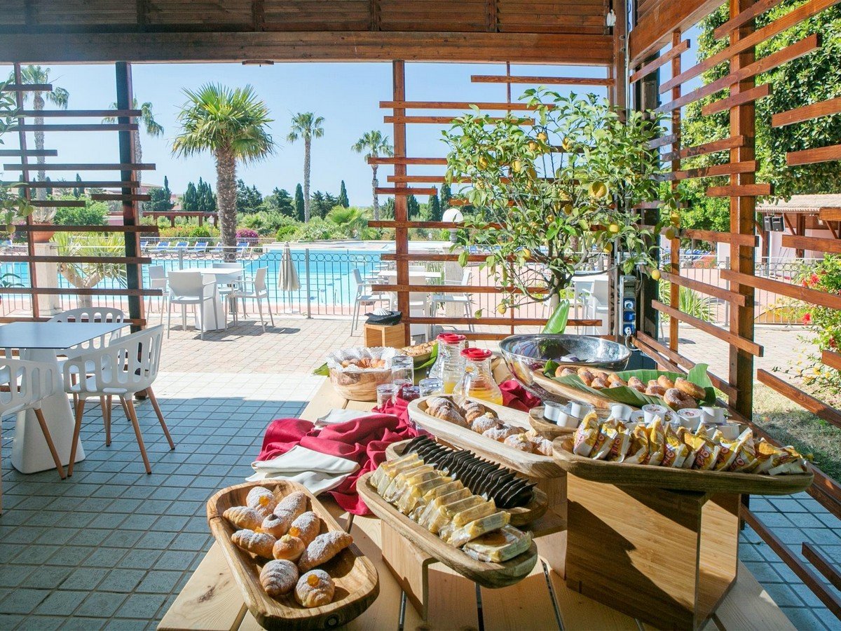 - Ristorante centrale: due sale climatizzate dove vengono serviti colazione, pranzo e cena a buffet. Acqua minerale e vino locale in caraffa sono sempre inclusi. I tavoli sono liberi a riempimento, per garantire la massima flessibilità.