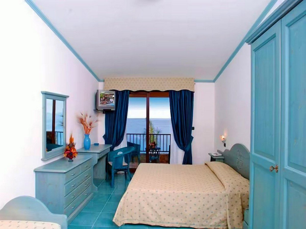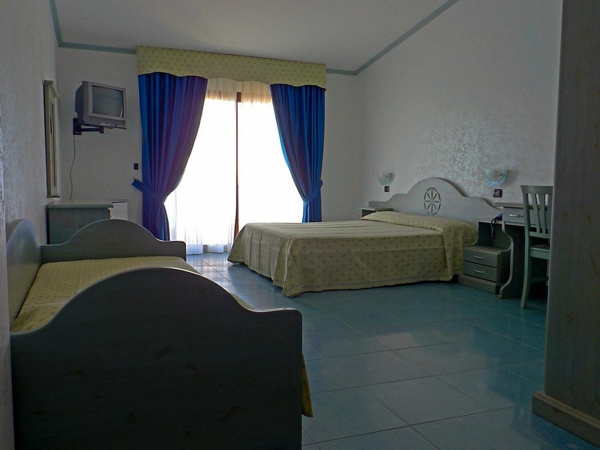 Camere semplici ed informali, con tv, aria condizionata, frigorifero, cassaforte, servizi con doccia e asciugacapelli. In un edificio disposto intorno alla piscina, a ridosso della spiaggia, camere Classic per 2/4 persone, si dividono in Vista Monte al primo piano con balcone in zona silenziosa, Vista Mare o Piscina, al primo piano con piccolo balcone o al piano terra con veranda (alcune quadruple con letti a castello); Bicamere Family per 3/5 persone, tutte vista piscina, con soggiorno con divano letto a castello, camera matrimoniale, con terrazzo al primo piano o veranda al piano terra. Disponibili inoltre, camere Smart vista retro, dagli arredi semplici e funzionali, ubicate al piano terra, con piccolo spazio esterno condiviso. In un corpo separato, in posizione panoramica sul mare, dal quale dista 150 m ca, camere Panorama, con letti piani, tutte vista mare, con balcone al primo piano o veranda al piano terra, alcune con possibilità di 5° letto aggiunto