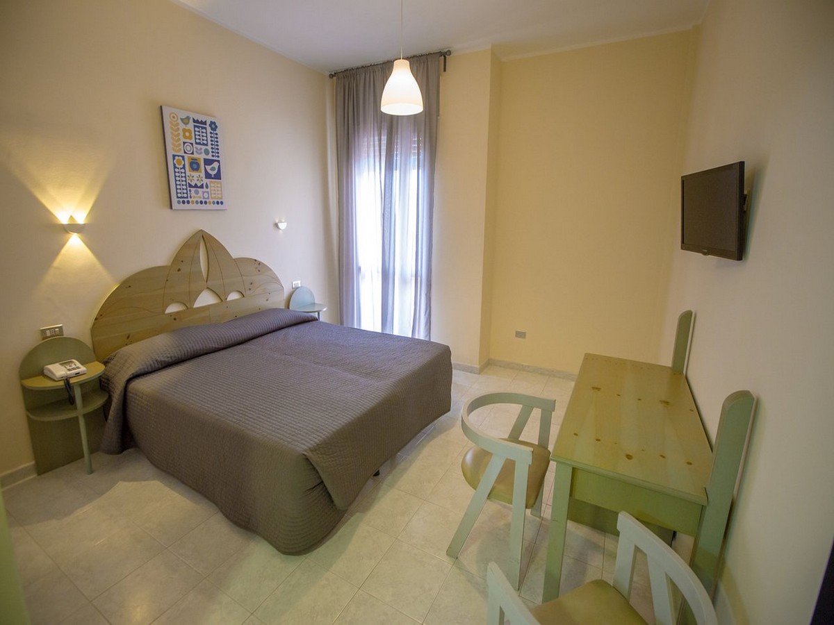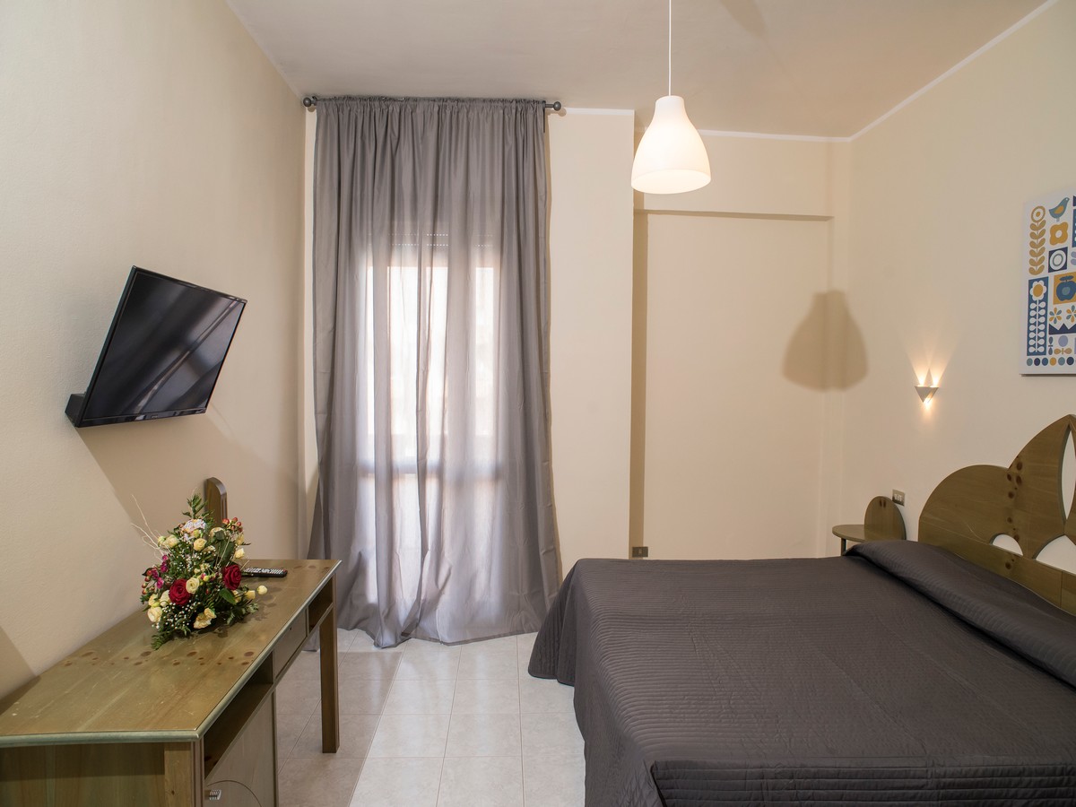 - Standard: Sono distribuite nelle 2 ali dell’hotel, collegate da un parco centrale. Sono arredate con semplicità, ampie ed accoglienti; oltre al balcone dispongono di asciugacapelli, cassaforte, telefono, televisore, aria condizionata, frigo e culle.