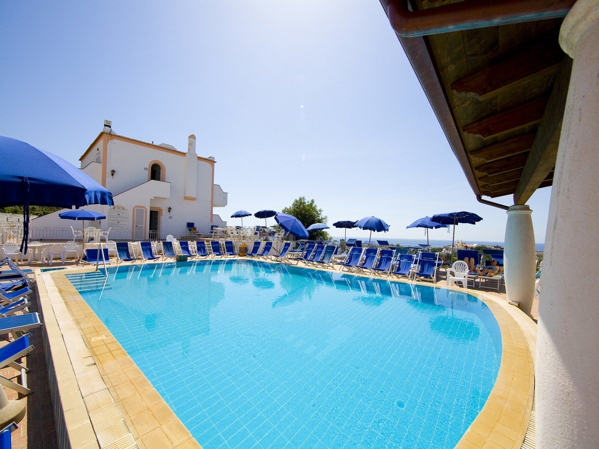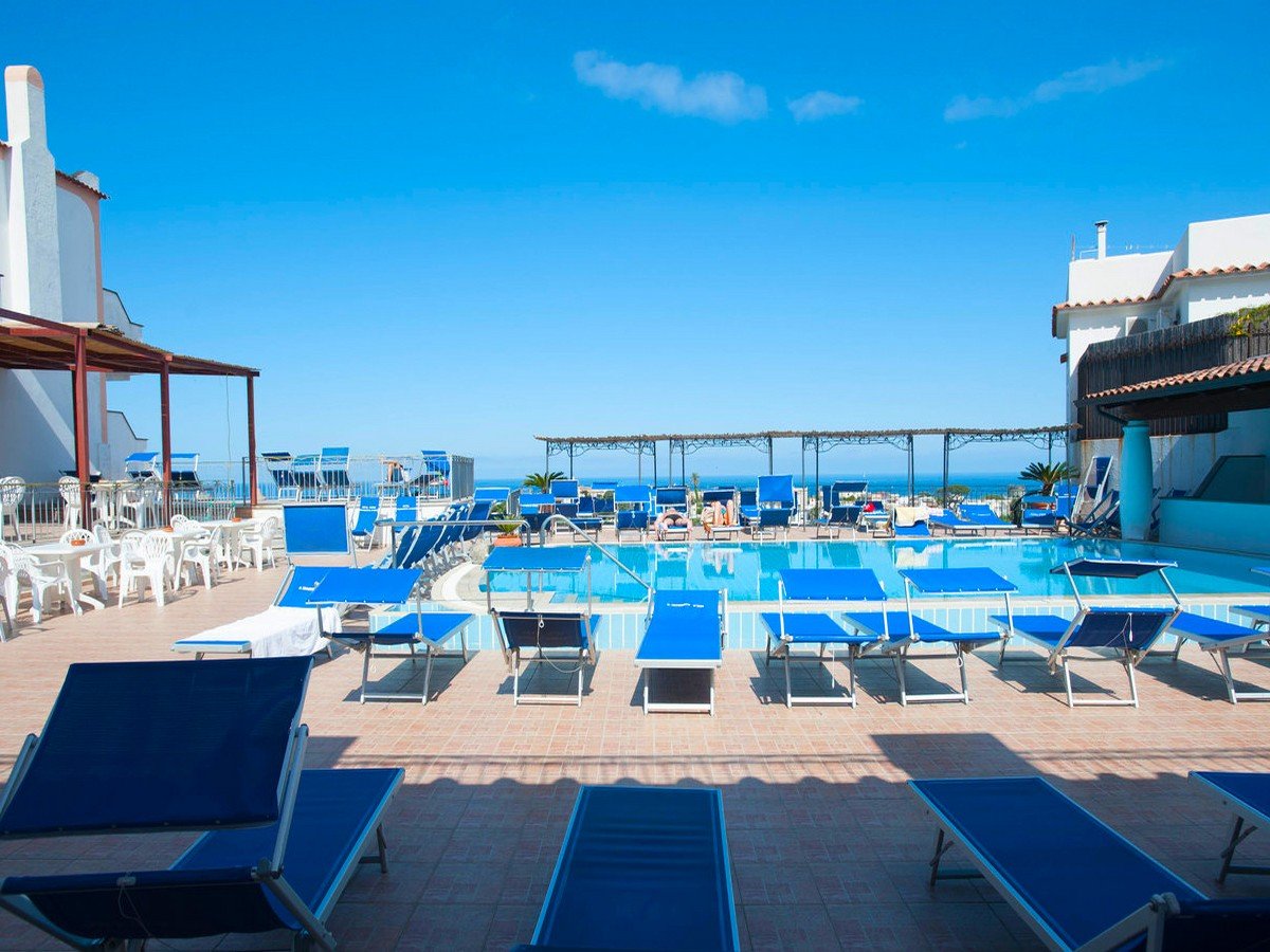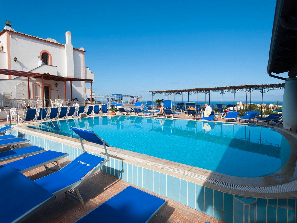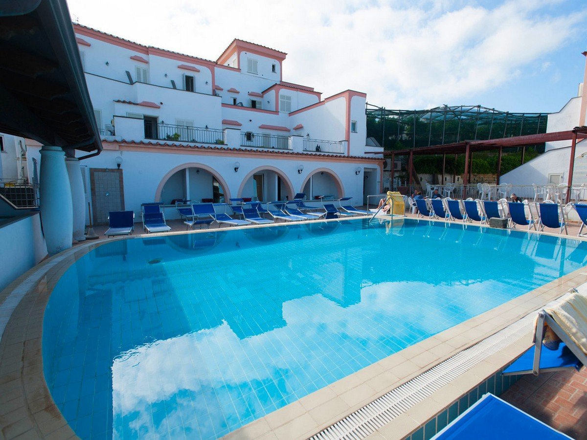 All'interno della struttura piccola piscina in acqua termo-minerale calda (30°-35°) con cascata idromassaggio cervicale e piscina in acqua minerale calda (30°-35°) con idromassaggio Air-pool, e bagno turco. Sul terrazzo panoramico, c'è la piscina esterna in acqua minerale (non riscaldata) ai cui bordi sono disponibili sdraie, lettini ed ombrelloni. All'interno, centro convenzionato con il Servizio Sanitario Nazionale, per le cure fangoterapiche e cure inalatorie/aerosol, abbinate alla possibilità di scegliere tra una vasta gamma di massaggi curativi e trattamenti estetici tutto questo renderà la vacanza una occasione di benessere e cura. SPIAGGIA: Camminando per circa un km si può arrivare alla spiaggia di Citara, conosciuta anche come spiaggia delle Pietre Rosse per via dei rossi scogli che affiorano in acqua. A poco più di 4 km si trova la Baia di Sorgeto, raggiungibile solo scendendo per più di 200 scalini per giungere in una spiaggia di ciottoli e sassi ma con acqua termale che sgorga dal sottosuolo. Per chi non vuole fare le scale in salita c’è un servizio di taxi-boat. La Spiaggia della Chiaia con bassi fondali a circa 1,6 km.