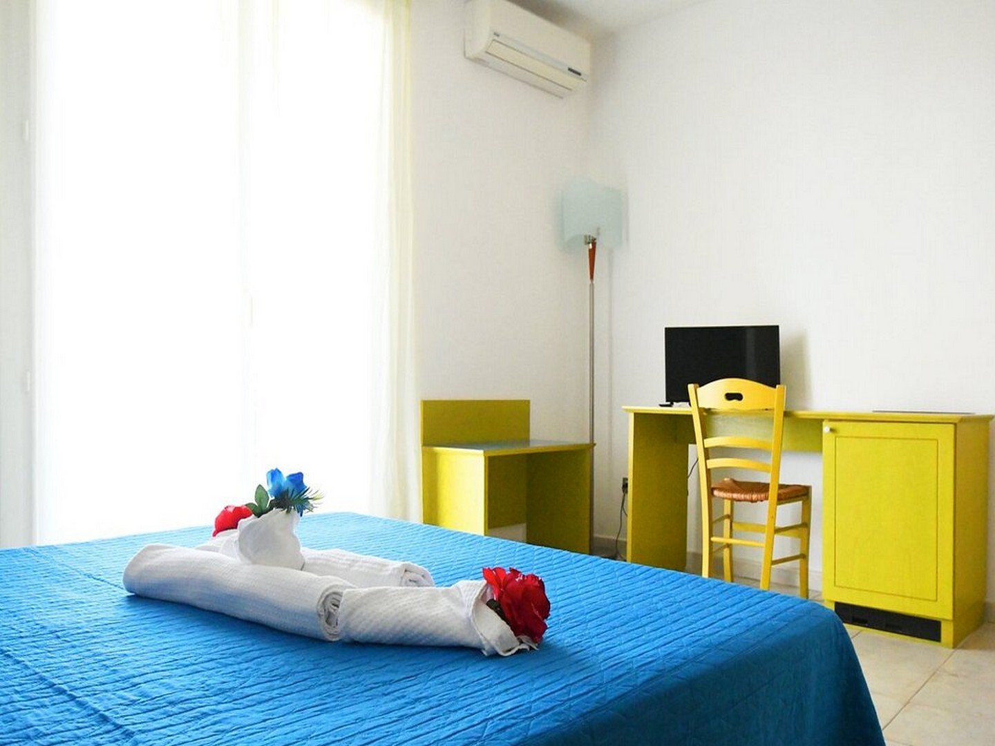 Le camere sono tutte dotate di aria condizionata, frigorifero, Tv- Sat, radio, bagno con box doccia, balcone attrezzato con tavolo e sedie. Riassetto camera giornaliero, cambio biancheria da bagno a giorni alterni, cambio lenzuola 1 volta a settimana. Sono disponibili come: