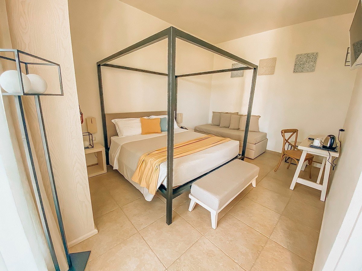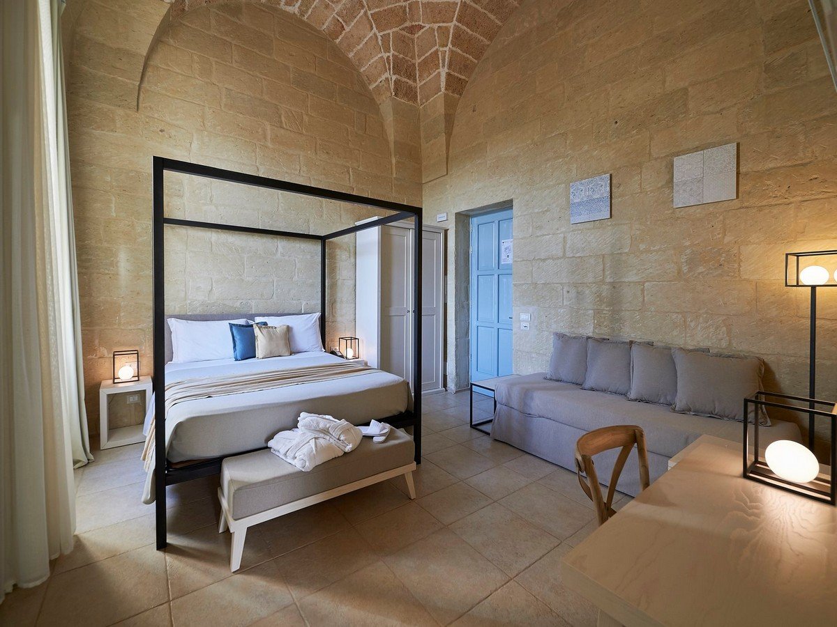 - 6 Suite con supplemento (doppio ambiente con ingresso con divano letto 2 posti estraibile e camera matrimoniale). Sono disponibili inoltre camere situate all’interno della antica masseria e sono suddivise in:
