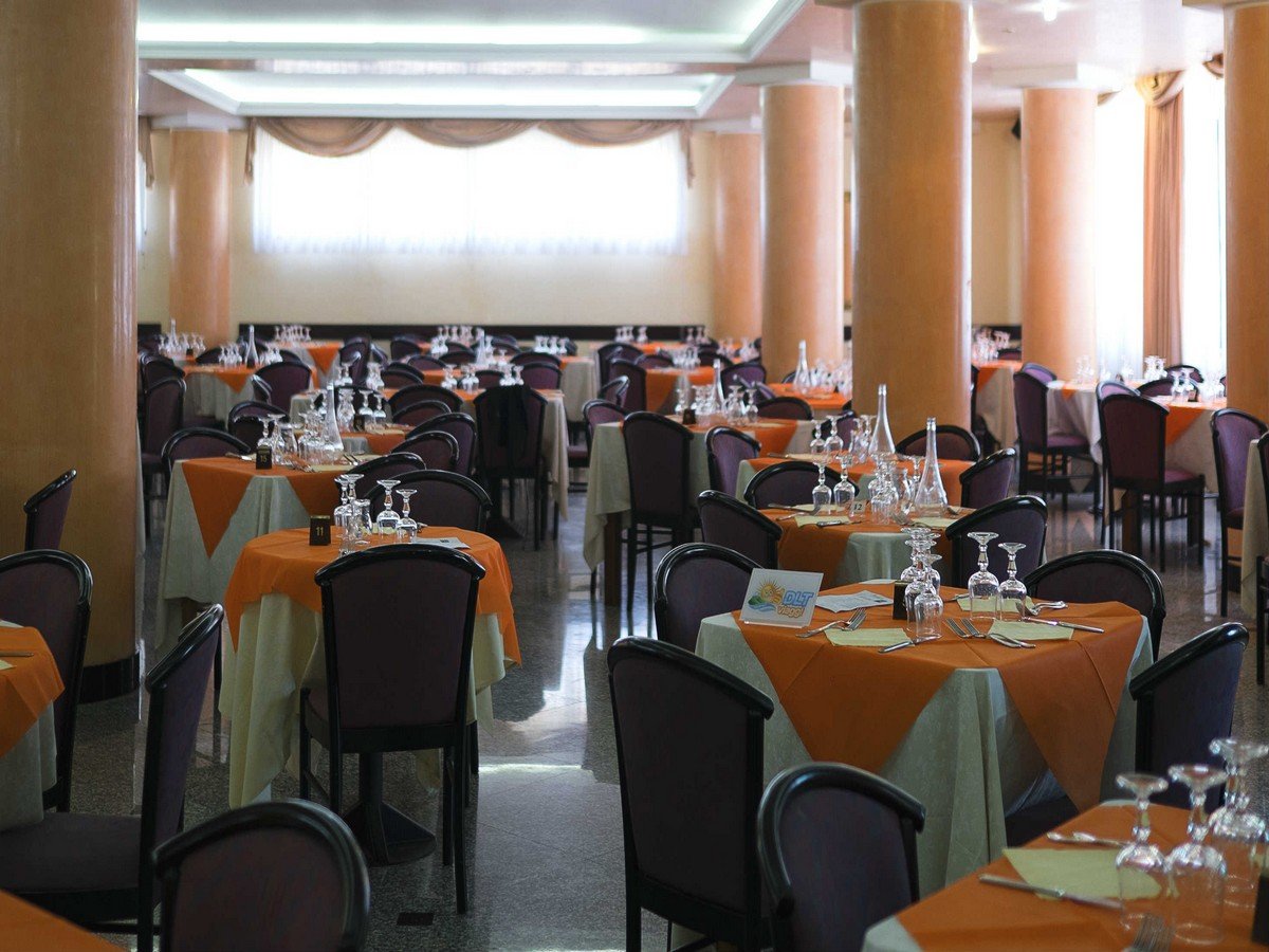 Ristorante (prima colazione a buffet tipica della tradizione italiana con base dolce, con distributori automatici di bevande calde e fredde, pranzo e cena con servizio al tavolo o a buffet assistiti dal personale di sala per la composizione dei piatti delle portate principali per mantenere alto il livello di decoro e di igiene, acqua e vino da distributori automatici ai pasti senza limitazione). Possibilità di menù celiaci con supplemento da regolare in loco (pasti senza glutine a menù fisso senza scelta con cambio giornaliero).