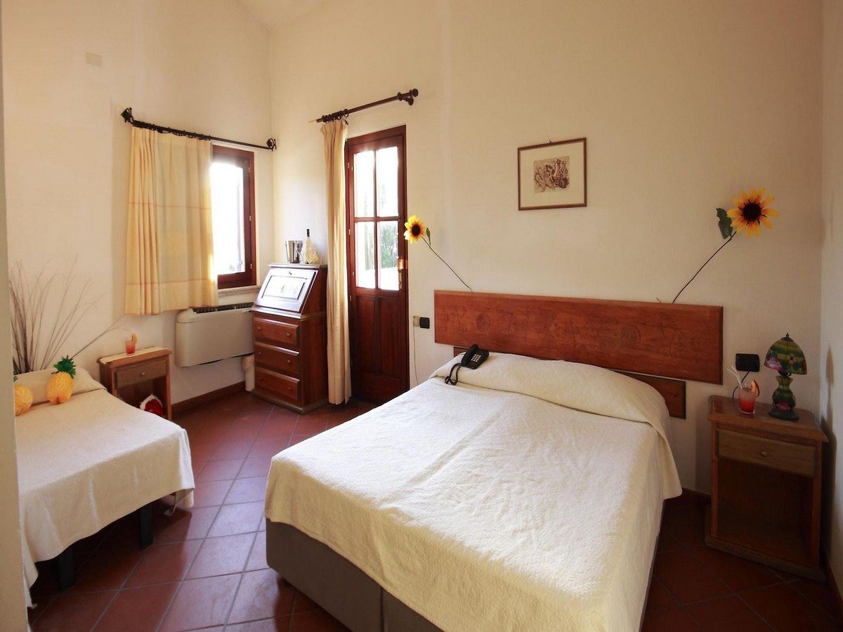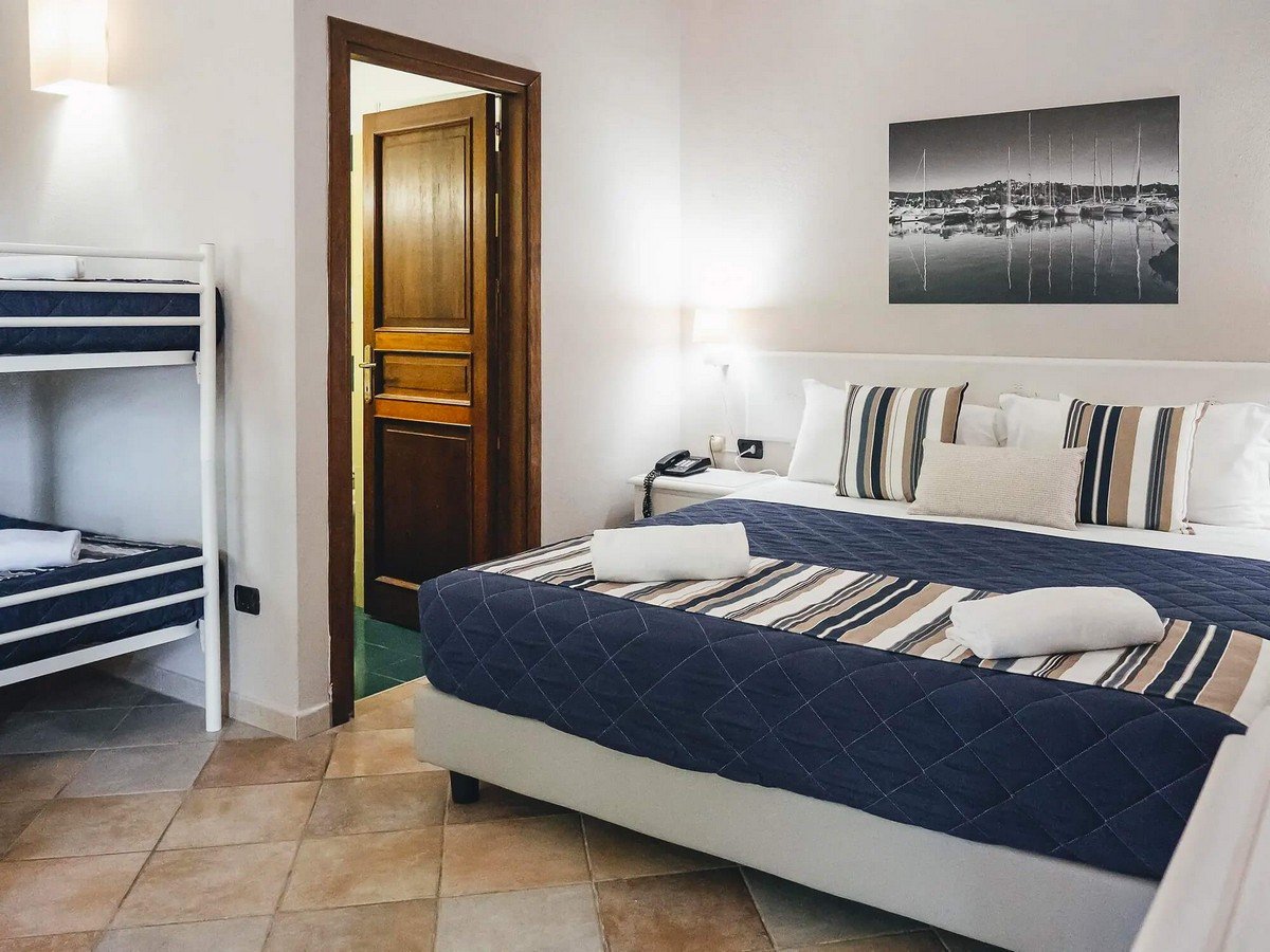 La struttura dispone di 115 camere in tipico stile sardo, recentemente ristrutturate ed immerse in uno splendido giardino e si suddividono tra un corpo centrale di 3 piani asservito di ascensore (che arriva fino al secondo piano) ove tutte le camere sono dotate di balcone ed hanno diversi affacci a seconda della posizione e deliziosi bungalow a piano terra con patio o al primo piano con balcone. L’hotel dispone di camere Standard che si suddividono in: Doppie/Triple, ove è possibile aggiungere la culla, e Quadruple Standard con letti a castello. Disponibili due Quadruple Standard Soppalcate con letti bassi (nel soppalco non è presente l’aria condizionata) e due Singole Standard con un lettino. Tutte le camere sono dotate di servizi con doccia, aria condizionata, minibar (fornitura su richiesta e a pagamento), TV, cassetta di sicurezza, telefono ed asciugacapelli. Gli esterni delle camere sono attrezzati con sedie e stendini. Disponibili camere attrezzate per gli ospiti diversamente abili.